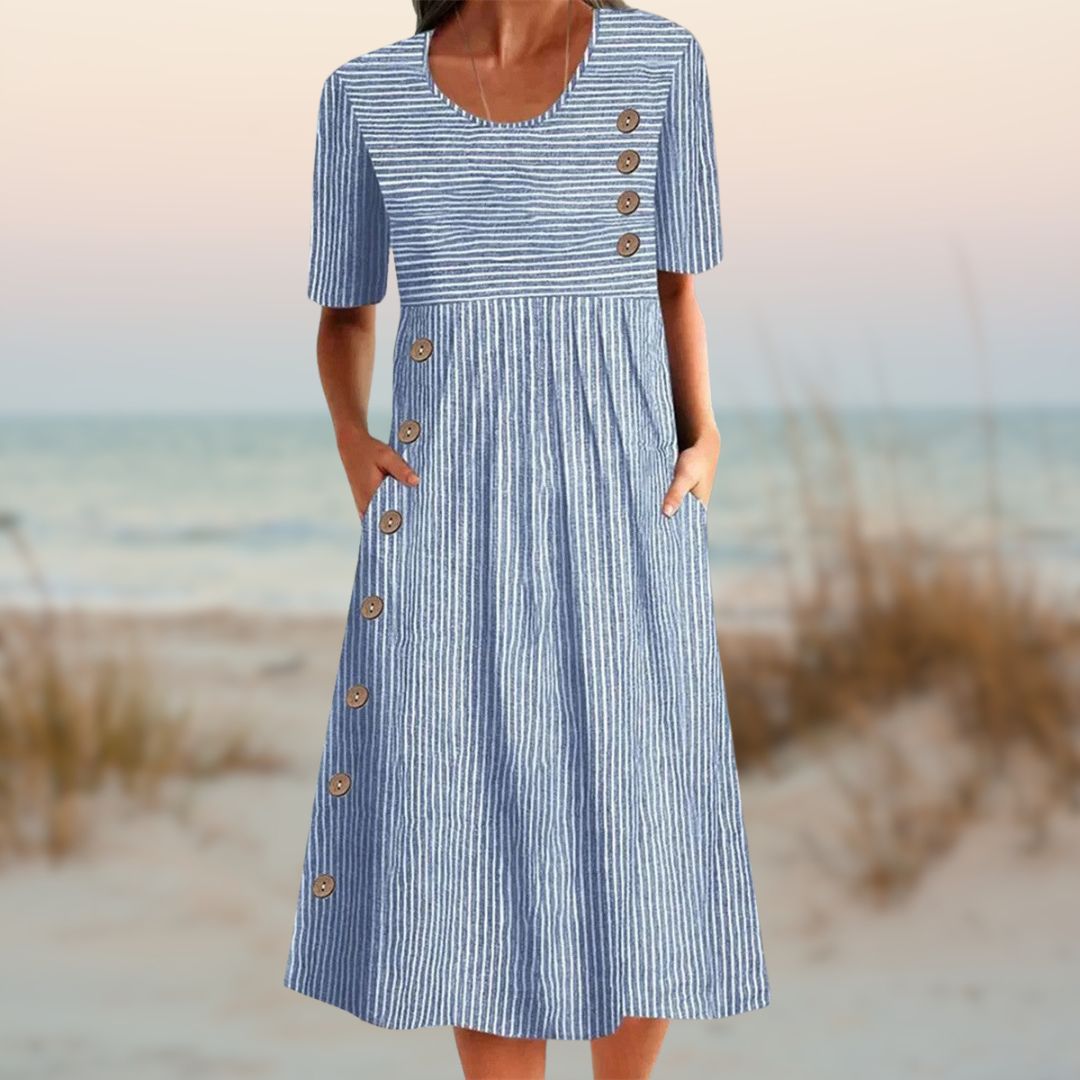 Designed for warm-weather ease, this midi dress blends soft structure with subtle detail. The striped layout adds rhythm to the silhouette, while decorative buttons and a shaped waist bring visual balance. With a breathable feel and practical side pockets, it’s an easy choice for market strolls, garden lunches, or daytime outings.