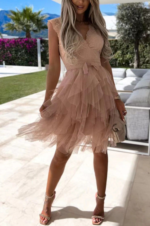 Step out in elegance with this beautifully detailed mini dress, designed to celebrate both comfort and sophistication. The delicate lace-up detail and flattering V-neck add a touch of refinement, while the sleeveless silhouette keeps things effortlessly chic.