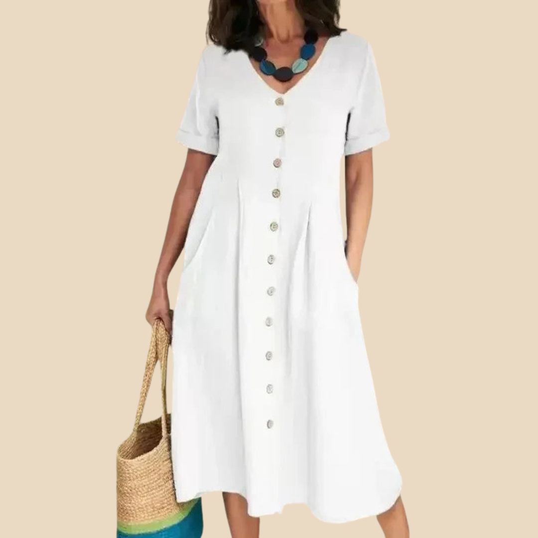 This flattering button-front dress blends ease and structure for effortless warm-weather style. With its softly flared skirt and cinched waist, it creates a balanced silhouette that feels both polished and casual. The practical details and airy drape make it ideal for daily errands, weekend outings, or slow sunny afternoons.